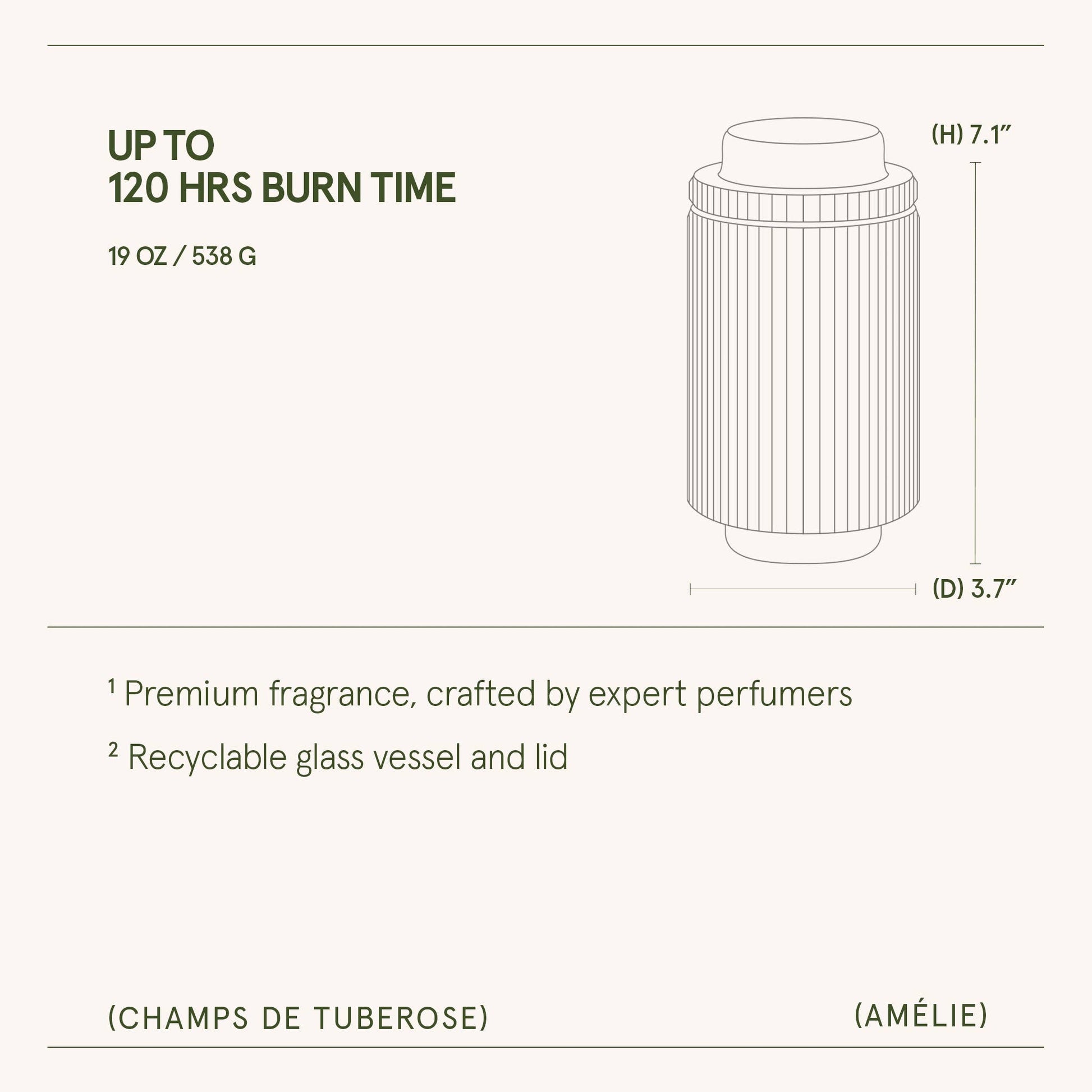 Elevate your space with Amélie: Timeless ribbed glass candles, reminiscent of the Acropolis grandeur. Available in calming colors, they offer a sustainable 120-hour burn with natural soy wax and seamlessly become elegant keepsake containers. A lush and alluring fragrance that opens with the delicate allure of Bergamot, Jasmine Petals, Gardenia, and Ylang, leading into a heart of creamy Tuberose and Toasted Coconut, while resting on a warm base of Musk and Fresh Orange Blossom.
