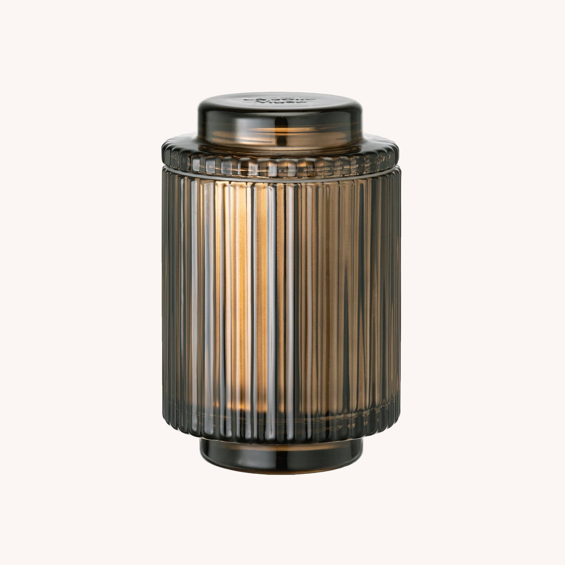 Elevate your space with Amélie: Timeless ribbed glass candles, reminiscent of the Acropolis' grandeur. Available in calming colors, they offer a sustainable 60-hour burn with natural soy wax and seamlessly become elegant keepsake containers. A captivating blend of saffron and fresh thyme evolves into a heart of velvety orris, raspberry, and violet, while a base of rugged cade, earthy moss, and warm vanilla lends depth to this aromatic fragrance.