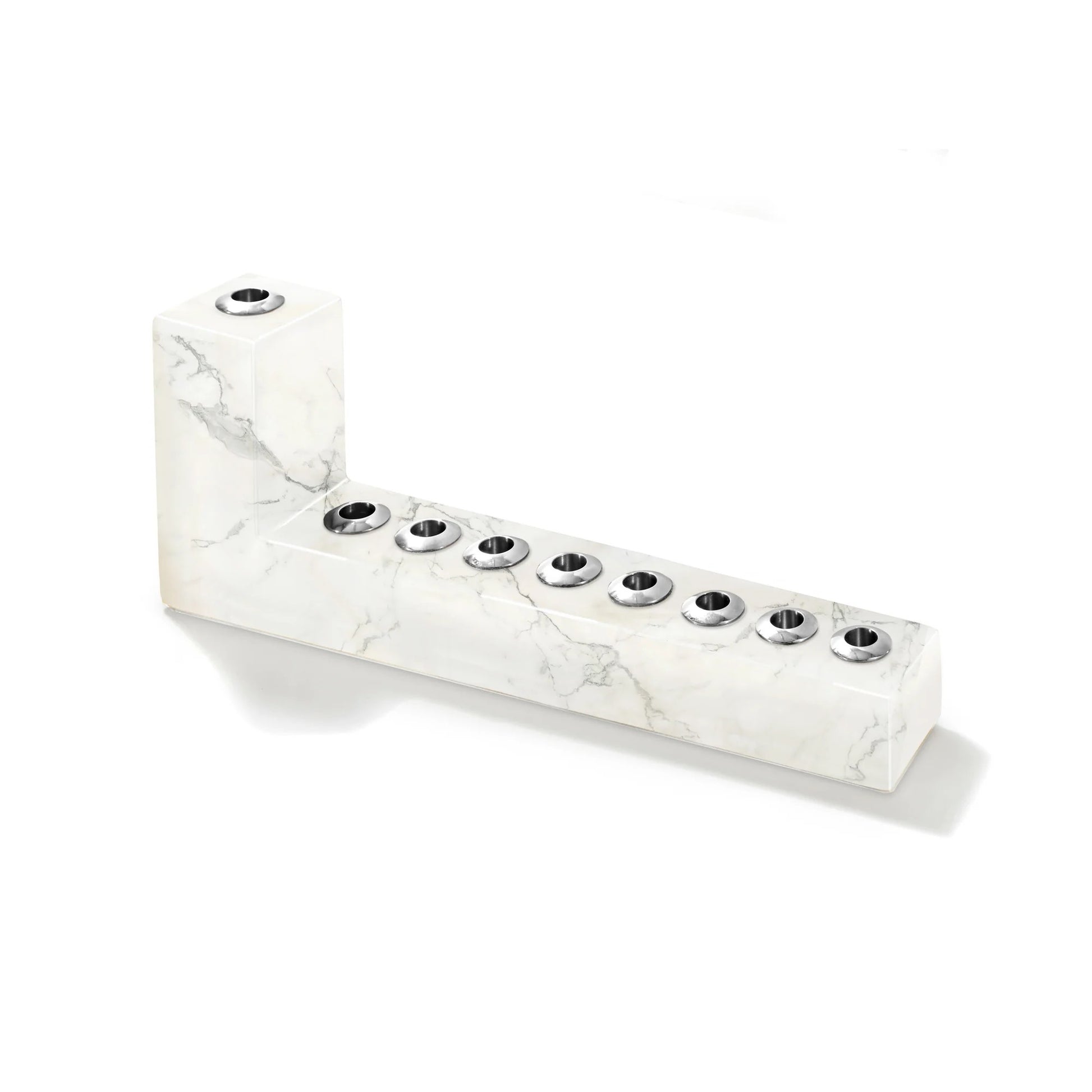 Our modern Brillante Menorahs help your holiday to shine. Hand-sculpted from Italian Carrara marble, this is the piece you'll reach for each Chanukkah. We precision-machine and polish the metal cups so they securely hold your candles (no more melting the bottoms!) and help them to burn straight down (minimal wax clean up!)