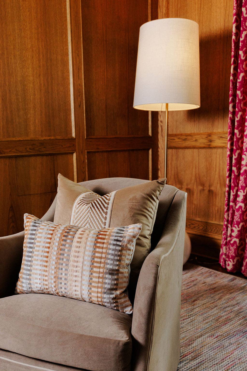 The Brooks pillow offers a striking embroidered arrow design wide tape in mushroom brown on a soft fawn velvet. The perfect combination of style and design. With an identical front and back, this pillow will look good from any angle. Down insert included. Sewn with care in the USA.