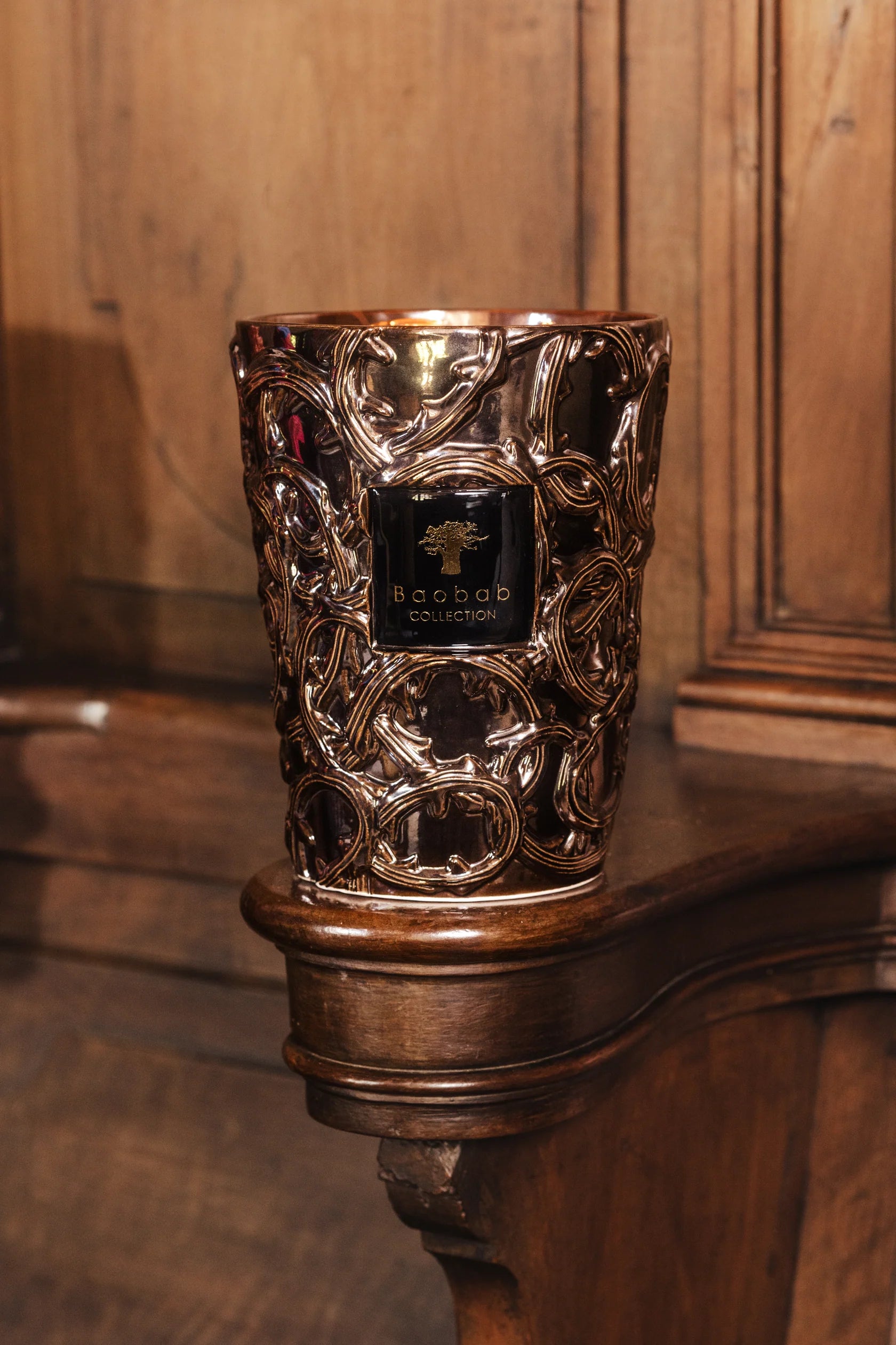The brown and saffron yellow tones of the design on the glass are in perfect harmony with the woody, spicy fragrance. The candle becomes an ethnic decorative object, in keeping with our brand DNA.