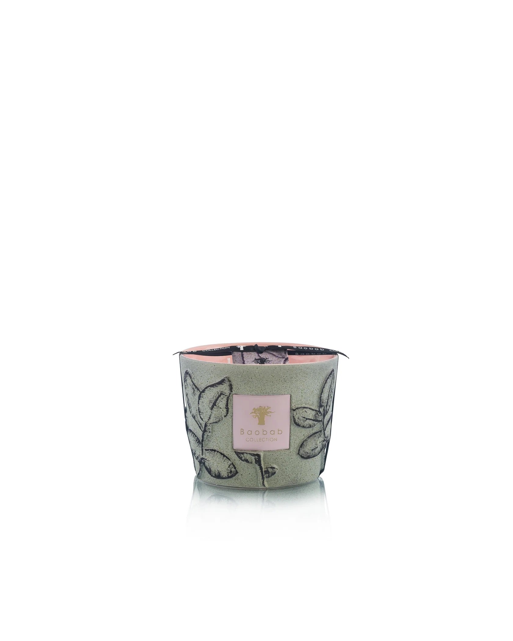 The materials contrast and complement each other in this fragrant, sculptural object, making it an unusual and elegant decoration for summer homes. The outside of the ceramic is dotted with plant motifs, branches and leaves, recalling the name of the candle, which describes Mediterranean vegetation made up of shrubs.