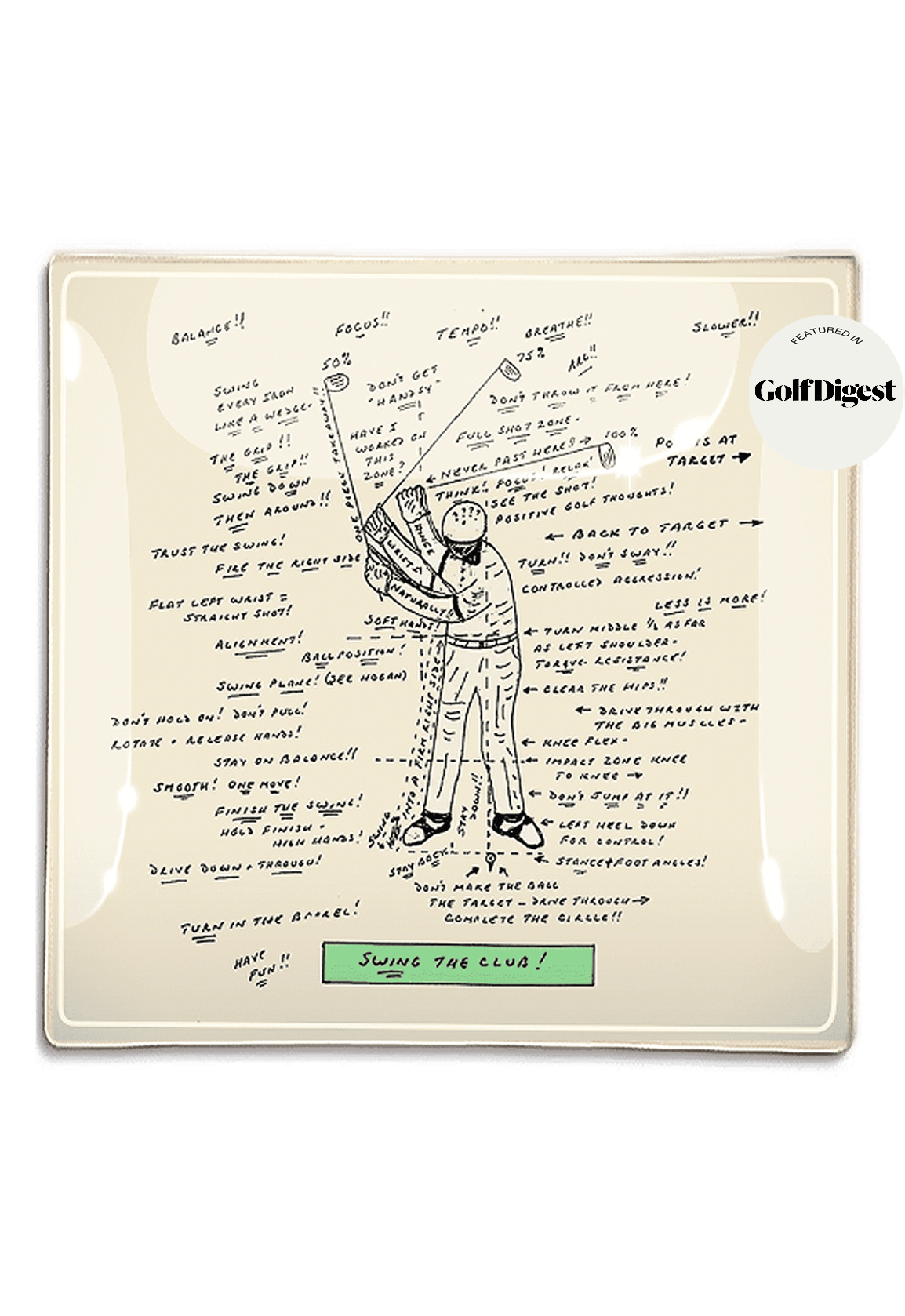 Handcrafted in our New York studio in the French tradition of decoupage, each bent-glass tray is layered with Ben’s own illustration, a tangle of golf wisdom and scribbled reminders that feel both intimate and universal. No two trays are ever exactly alike, each one signed by Ben, turning a practical object into a keepsake. Felted on the back, food safe, and wipe clean, it’s as useful as it is collectible—perfect for serving a round of cocktails, holding loose tees and cufflinks, or standing proudly as art in your home.