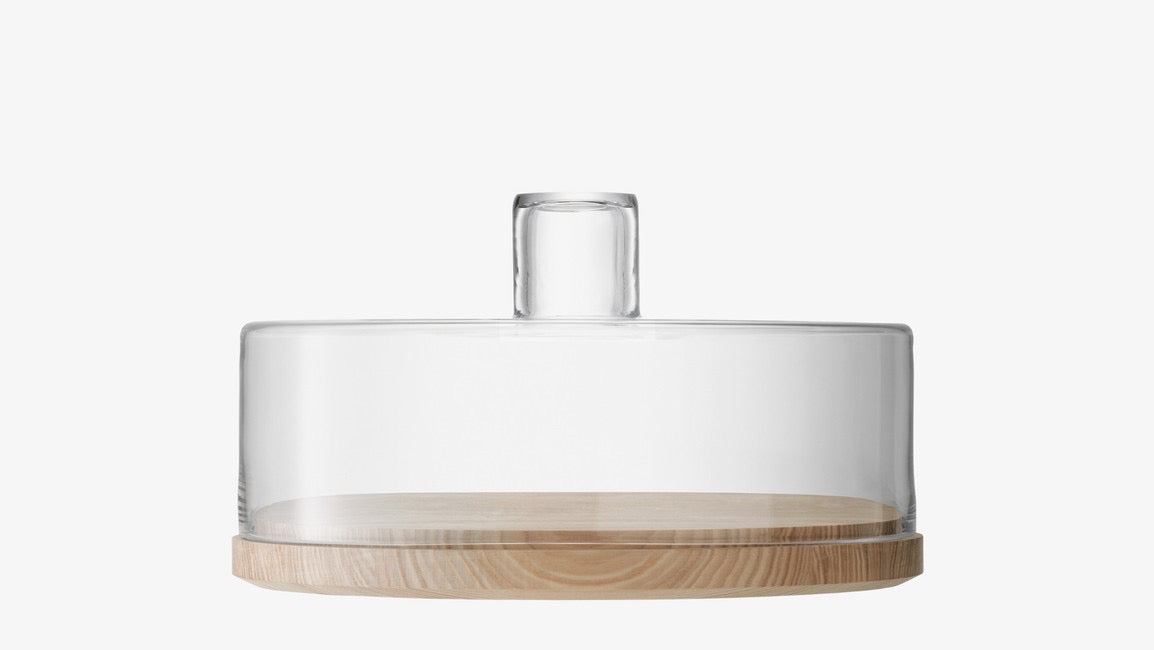 A low mouth-blown glass dome with cylindrical handle and natural wooden base. Measures 12.5" in diameter