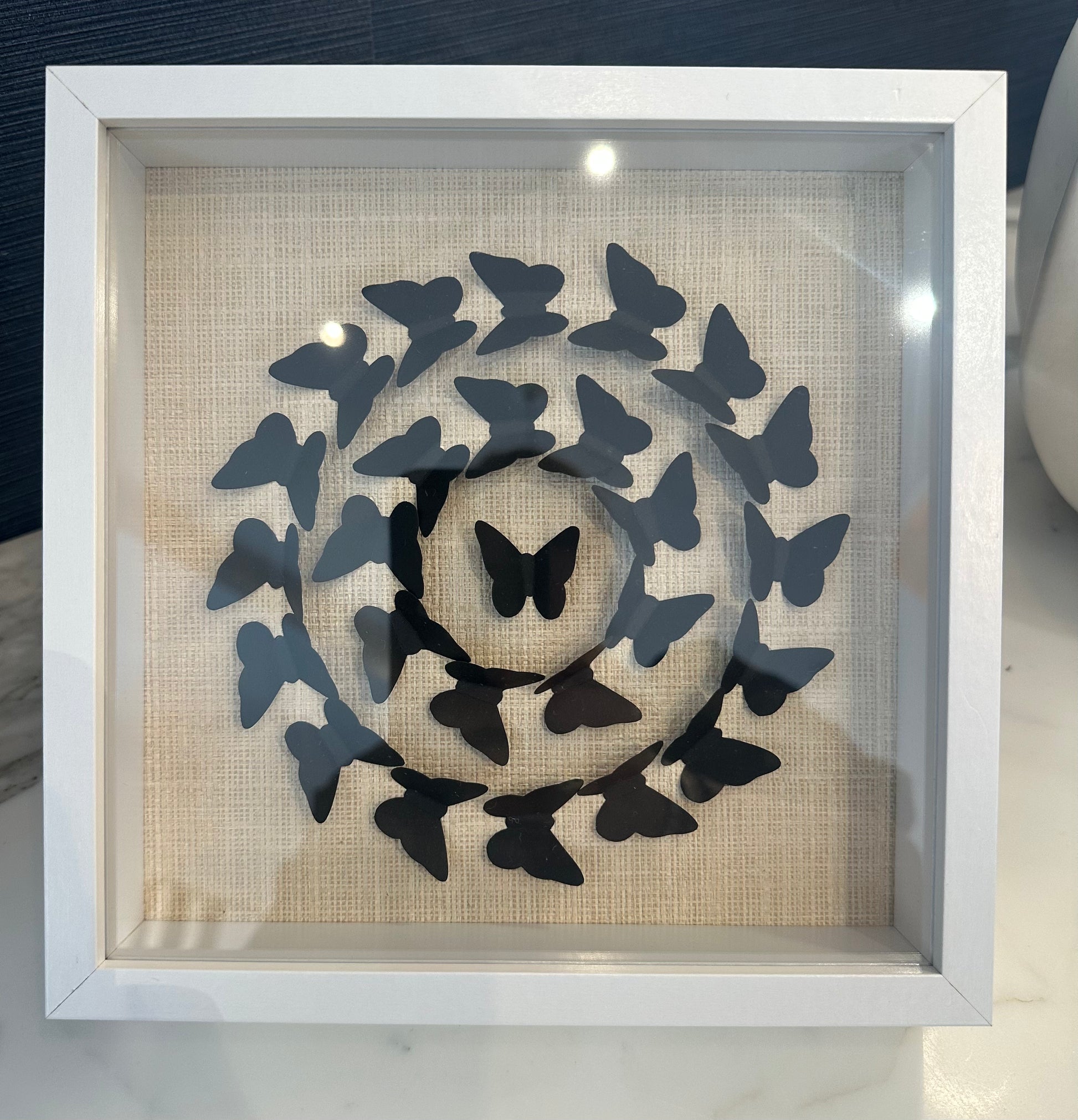 Our friend and local artist Maggie Joyce is well known for her colorful collages of butterflies and is now making a series of smalls for us to share with you. Contact the Rye shop to see all the colors and designs available. Framed in white wood and measuring 8-1/2" square.