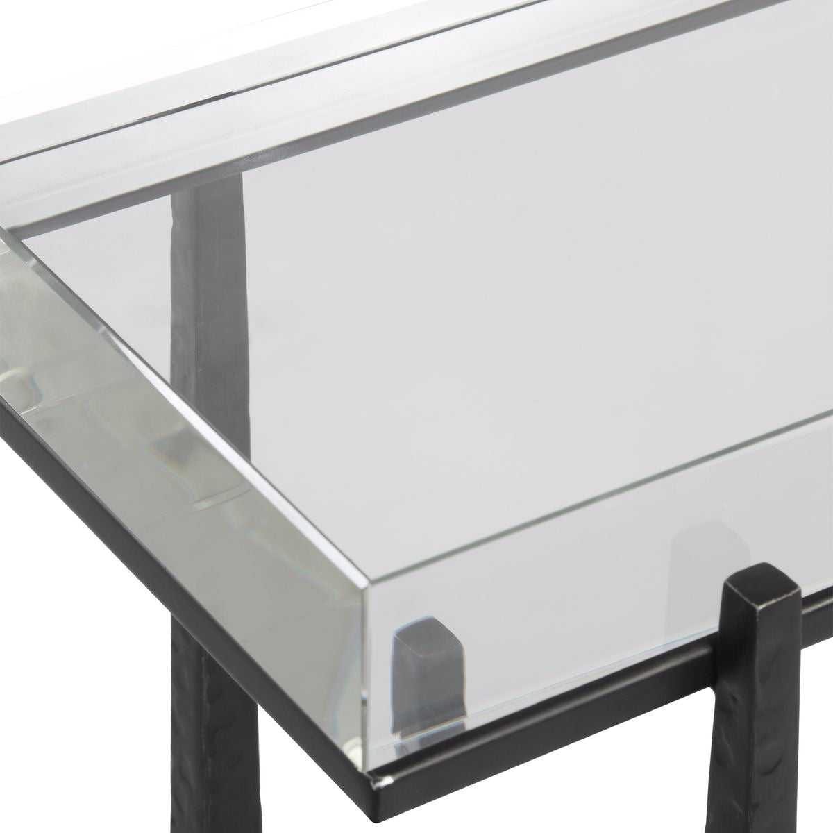 This elegant accent table adds a touch of luxury to any room. The textured dark bronze finished iron legs perfectly support and accentuate the thick crystal top.