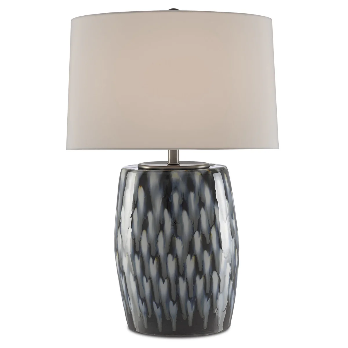 Plumes of indigo and cloud-colored blues rise up the body of our Milner Blue Table Lamp made of porcelain. This is one of our offerings that illustrates how our finish artisans love to experiment with handmade treatments. A gray birch silk drum shade echoes the light tones in the blue lamp's body.