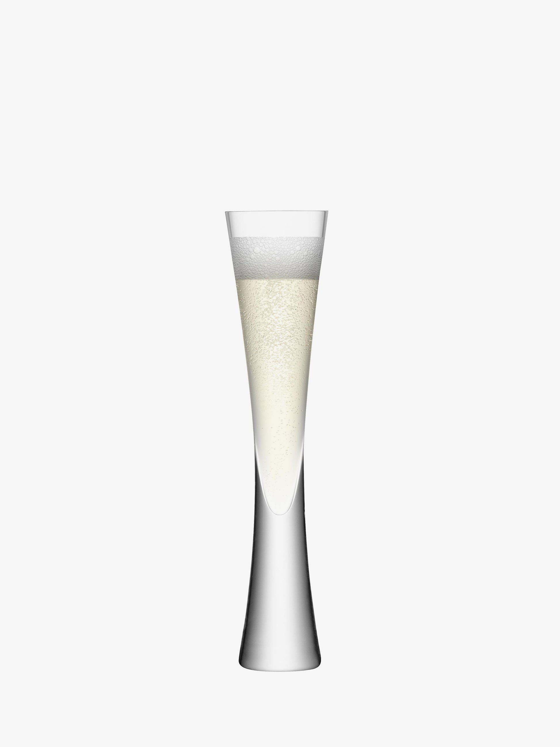 A mouth-blown glass champagne serving set. Each flute's fine bowl and thick, flared stem is mouth blown as one piece of glass. The ice bucket has a complementary curved design, thick walls and heavy base.