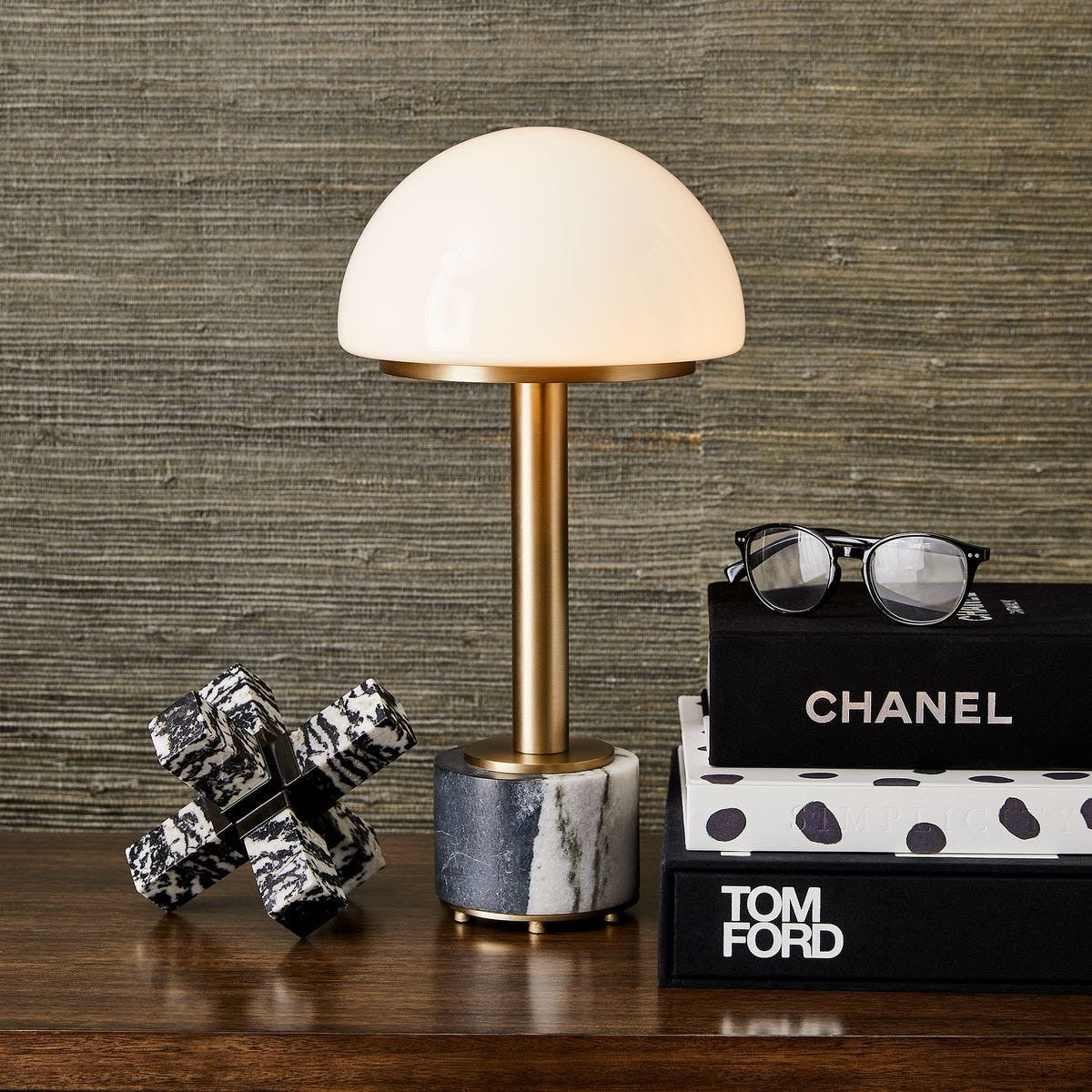Mushrooms appear everywhere, and you will want these fun mini lamps everywhere in your home. Standing at just 15 inches high, it features an opal glass shade, a rich brass column, and rounded panda marble base with a footed brass plate. Utilize the in-line dimmer switch for optimal lighting options. Due to the nature of natural stone, each piece will vary in color and veining, including shades of black, white and green.