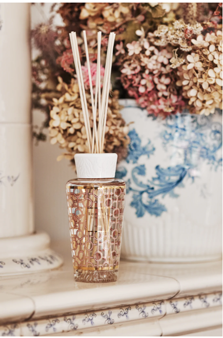 The decorative diffuser with a feminine aroma, Woman comes in a gold and powder pink design. The decoration on the glass fragrance diffuser is a representation of the feminine sign. The mixture of musky essential oils make the perfume of this rose diffuser totally feminine.