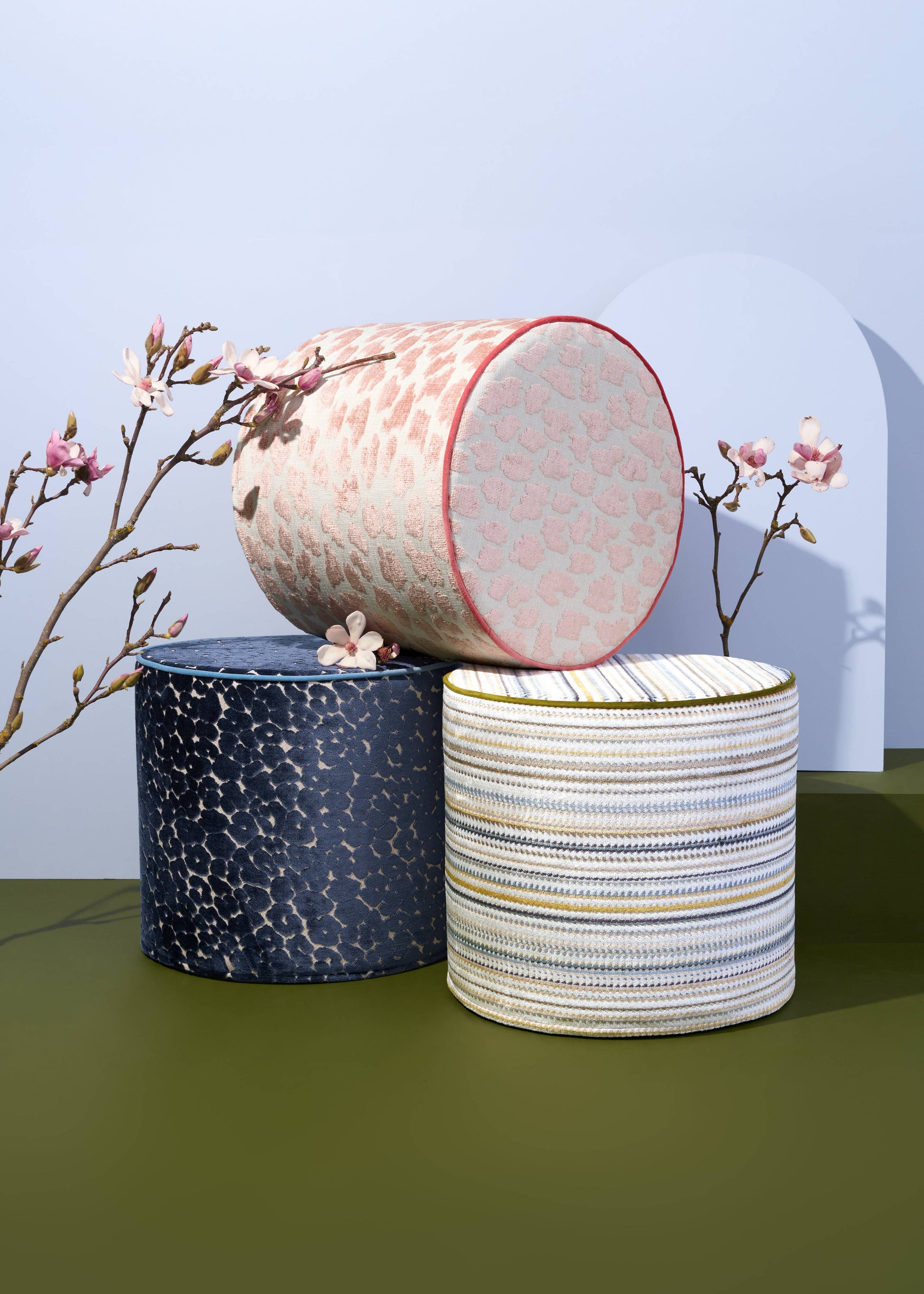 Madison Cadet base fabric with Chambray velvet cording. 18" round by 17" tall, slipcovered ottomans made with high-density foam and the highest quality materials, yet light enough to move around easily. Each Perch is a stylish statement piece in any living space with the added bonus of providing alternative seating when you need it.