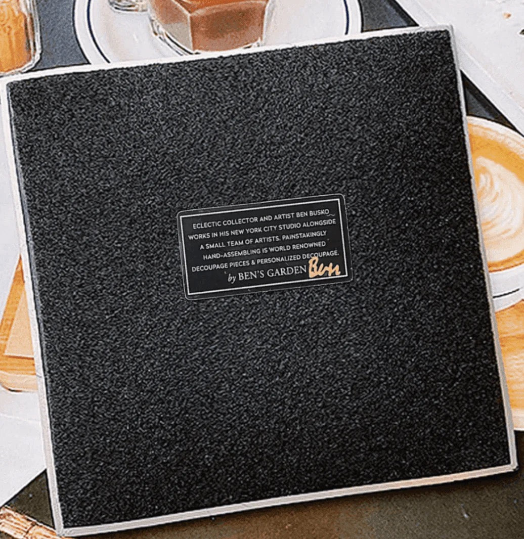 Both practical and charming, Ben's signature glass decoupage is food safe, wipe clean and the back side is felted. Also suitable for hanging with a plate hanger and attractive standing on a gallery easel. A folded card explaining the time honored decoupage process accompanies each piece.
