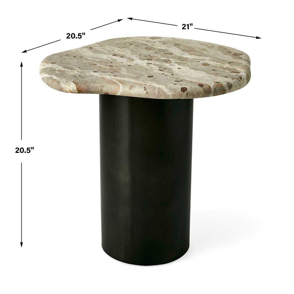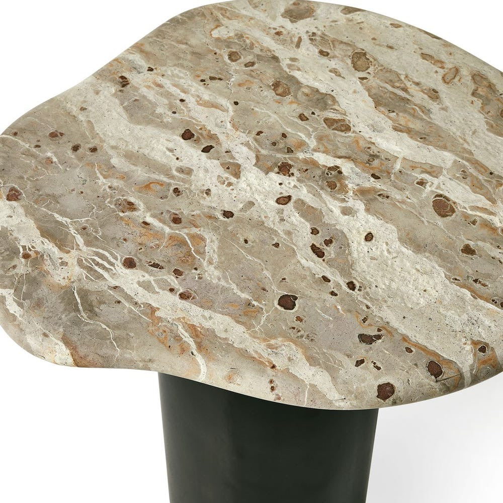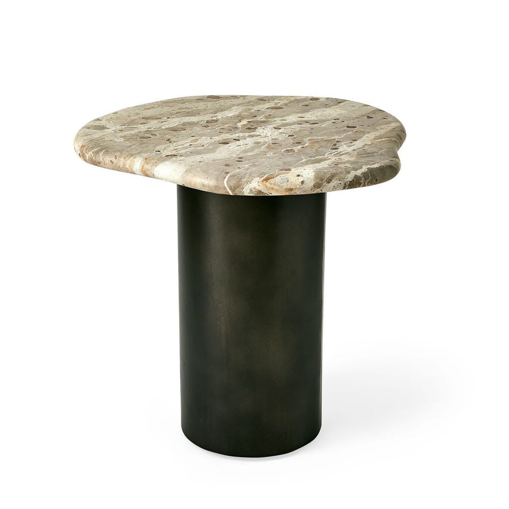 Amorphic shaped top made of honed marble with thick bullnose edge reflect patterns in shades of warm beige and gold. The steel base has a dark bronze satin powder coat finish. Due to the nature of marble, every piece will vary slightly ensuring yours is unique.