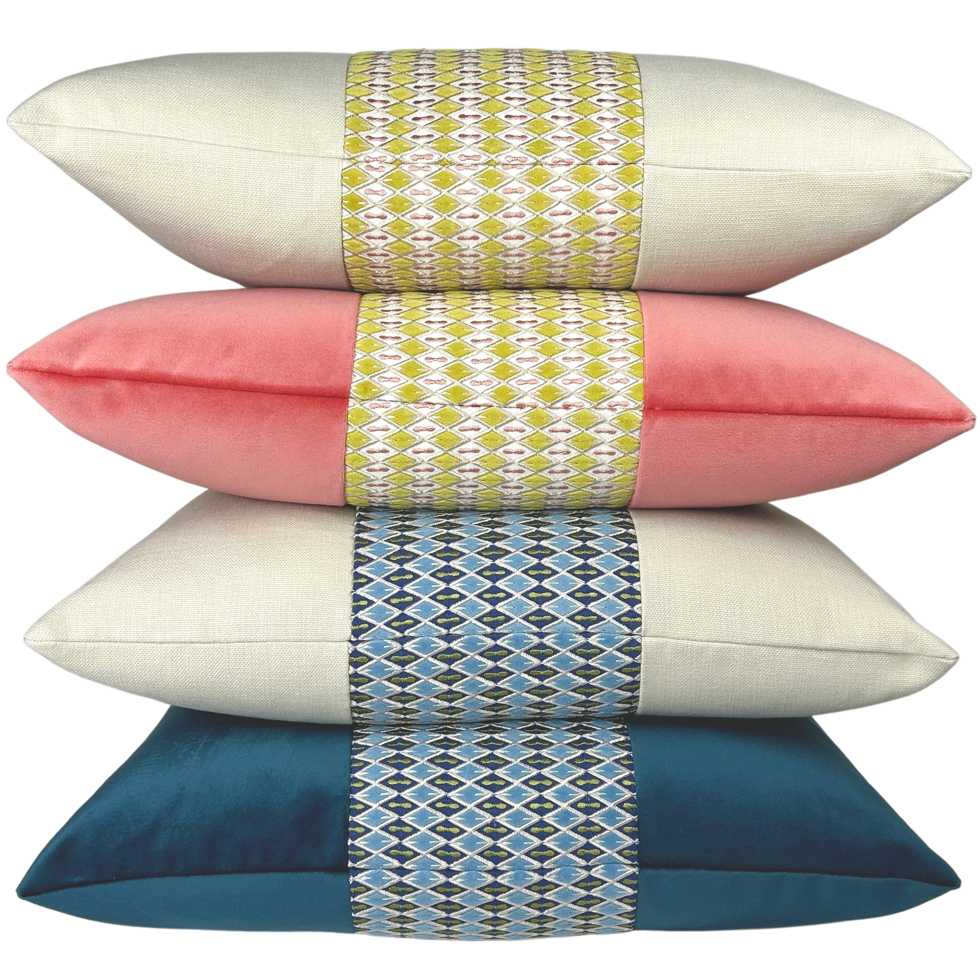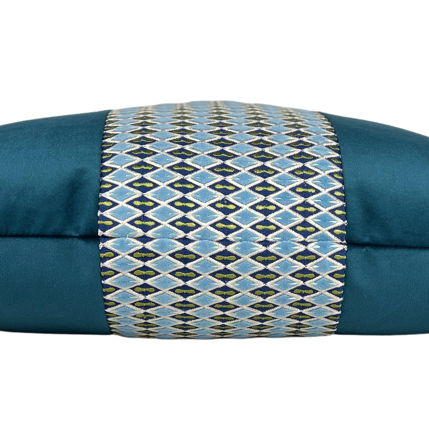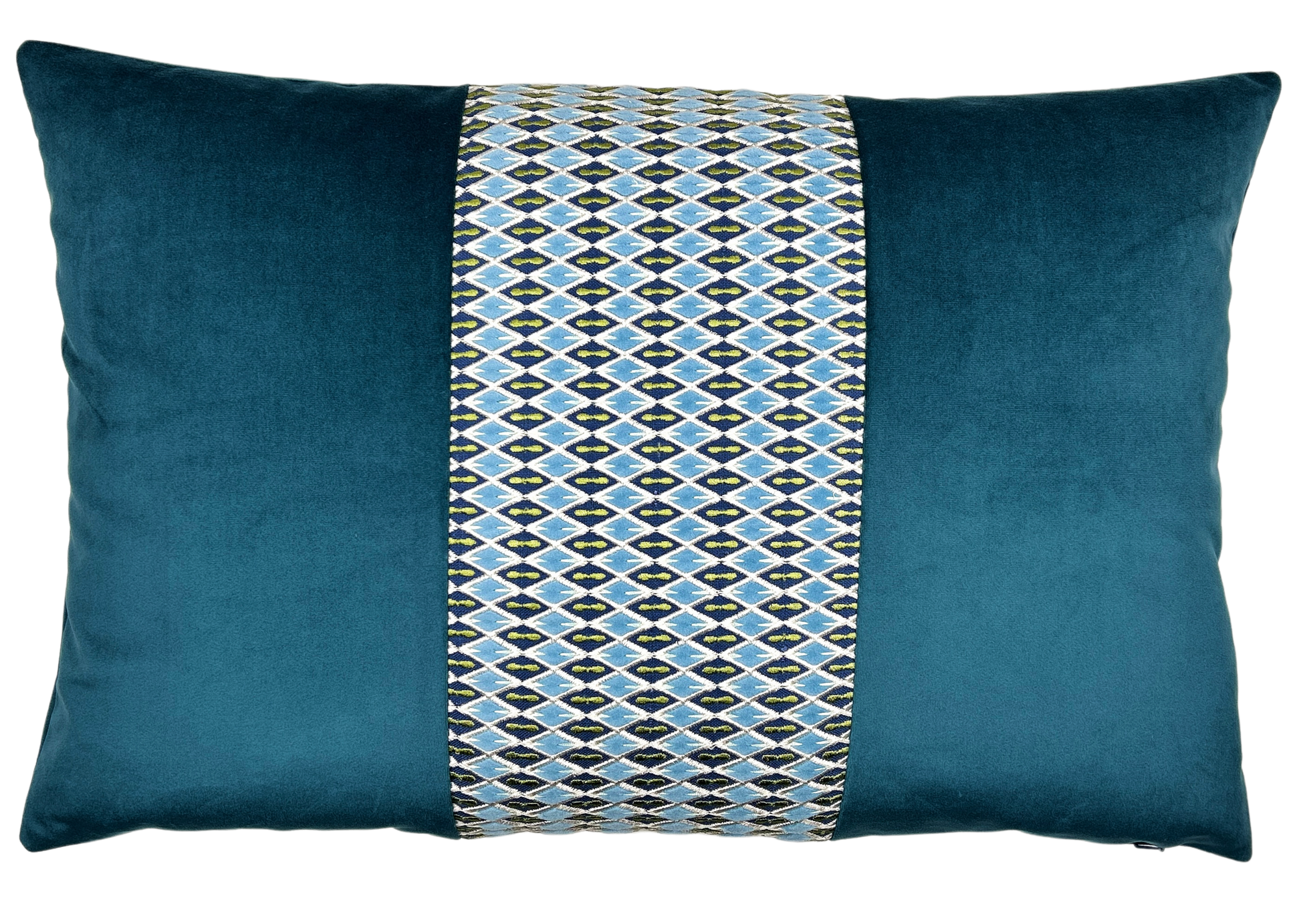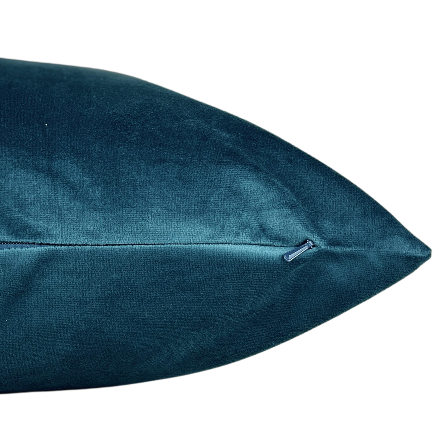Elevate your living space with this luxurious petrol blue velvet pillow. The intricate embroidered laser cut velvet tape adds a touch of elegance to both sides of this 22" x 22" square pillow. With an identical front and back, this pillow will look good from any angle. Down insert included. Sewn with care in the USA.