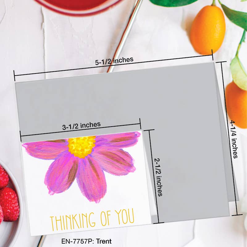 Celebrate meaningful moments with this handcrafted greeting card, featuring an original oil painting by artist Danilo Cuevas. Measuring 5.5 by 4.25 inches when folded, each card ships with a coordinating envelope and protective clear sleeve. The exterior reads "Thinking of you" while the interior remains blank for your personal message. Proudly produced in Illinois, this botanical-inspired design brings artisanal quality and thoughtful design to your correspondence.