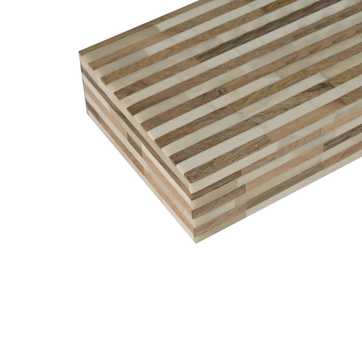 This elegant set of decorative boxes features a striking striped mosaic of bone inlay and kiln-dried mango wood, showcasing a perfect balance of natural materials and artisan craftsmanship.