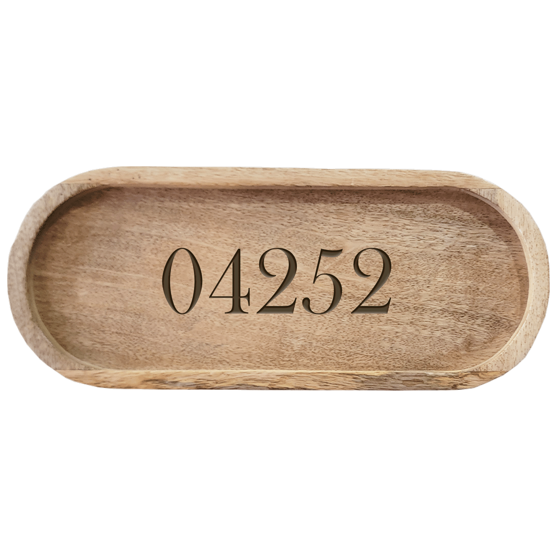 # Zip Code - Oval Wood Tray Handcrafted from warm mango wood, this oval tray combines rustic charm with functional elegance. Measuring 12" x 5" x 0.75", it's perfectly proportioned for serving, organizing, or displaying on a console table. The engraved zip code detail adds a personalized, sentimental touch—ideal for commemorating a meaningful location or gifting to someone special. Food-safe finish and durable construction make it as practical as it is beautiful.